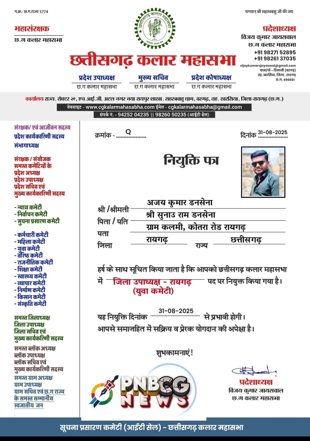PNBCG NEWS तिल्दा नेवरा रायपुर छत्तीसगढ़ संवाददाता पवन बघेल 31 अगस्त 2025रायगढ़ कलमी निवासी और साथ ही साथ समाज सेवी के रूप में काम करने वाले  श्री अजय डनसेना को  छ ग कलार महासभा छ ग का युवा कमेटी के जिला उपाध्यक्ष बनाया गया। इनकी नियुक्ति श्री विजय कुमार जायसवाल प्रदेश अध्यक्ष एवं महाध्यक्ष श्रीमति […]
