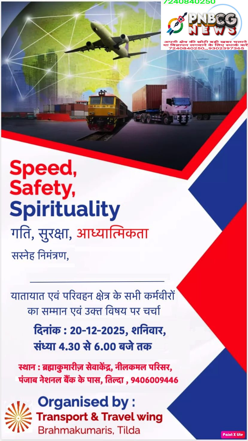 PNBCG NEWS TILDA NEORA तिल्दा। यातायात एवं परिवहन क्षेत्र में कार्यरत पेशेवरों, व्यवसायियों एवं सेवा में जुटे कर्मवीरों के लिए एक प्रेरणादायी एवं जनहितकारी कार्यक्रम का आयोजन ब्रह्माकुमारीज़ सेवा केंद्र, तिल्दा द्वारा किया जा रहा है। यह कार्यक्रम 20 दिसंबर 2025 (शुक्रवार) को शाम 4:30 बजे से ब्रह्माकुमारीज़ सेवा केंद्र, तिल्दा (पीएनबी एवं एचडीएफसी बैंक […]