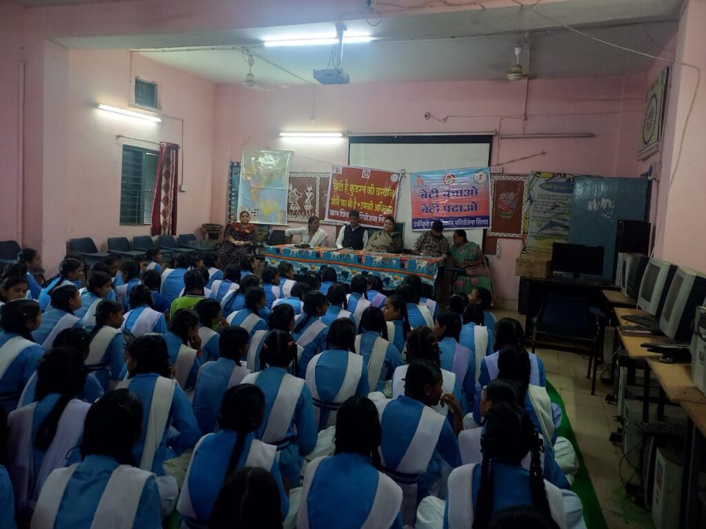 विद्यालय परिसर में महिला एवं बाल विकास विभाग तिल्दा नेवरा की परियोजना अधिकारी रंजना ठाकुर के मार्गदर्शन में सुपरवाइजर मोनिका, पार्वती और रानी सोनी ने कक्षा 9वीं से 12वीं तक की लगभग 150 बालिकाओं को गुड टच-बैड टच, पोषण, स्वास्थ्य, बेटी बचाओ बेटी पढ़ाओ तथा बालिका पढ़े- बालिका बढ़े विषय पर जागरूक किया।