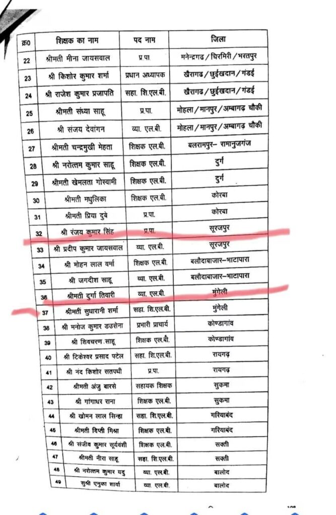 शिक्षा विभाग द्वारा जारी की गई आधिकारिक सूची के अनुसार, शैक्षणिक सत्र 2024-25 के लिए राज्यभर से कुल 64 शिक्षकों का चयन राज्यपाल शिक्षक सम्मान के लिए किया गया है। इस सूची में बलौदाबाजार जिले के दो शिक्षकों ने अपना स्थान बनाकर जिले का नाम रौशन किया है: