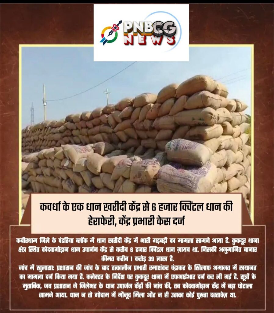 कवर्धा के एक धान खरीदी केंद्र से 6 हजार क्विंटल धान की हेराफेरी, केंद्र प्रभारी केस दर्ज