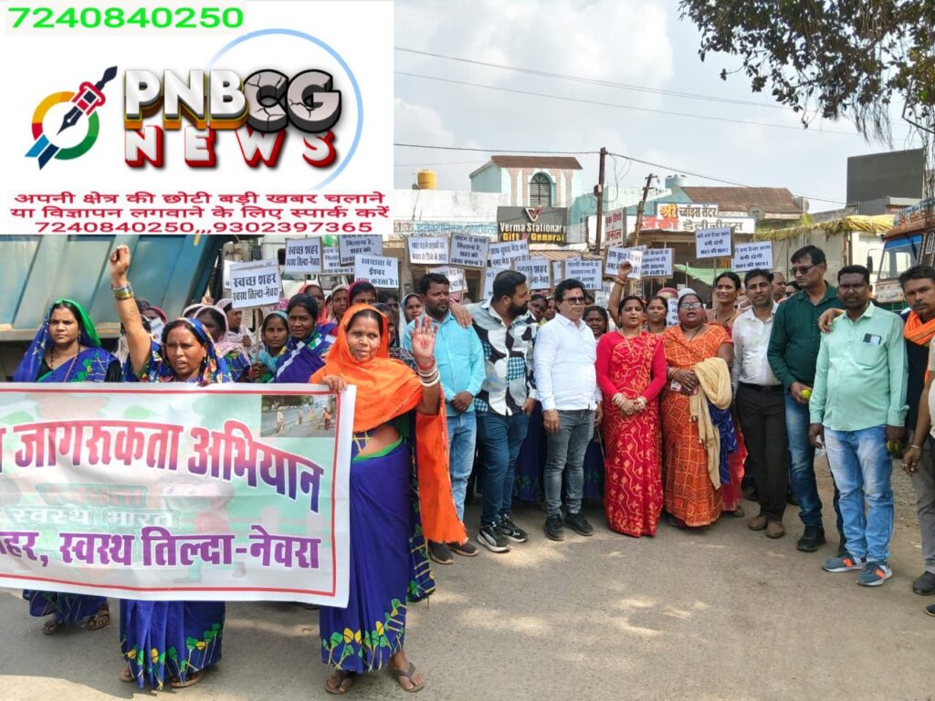 नगर पालिका परिषद तिल्दा नेवरा की अध्यक्ष श्रीमती चंद्रकला डॉ. खुमान वर्मा के नेतृत्व में आज स्वच्छता जनजागरण रैली निकाली गई। रैली का उद्देश्य आम नागरिकों को स्वच्छता के प्रति जागरूक करना और नगर को स्वच्छ रखने हेतु प्रेरित करना रहा।