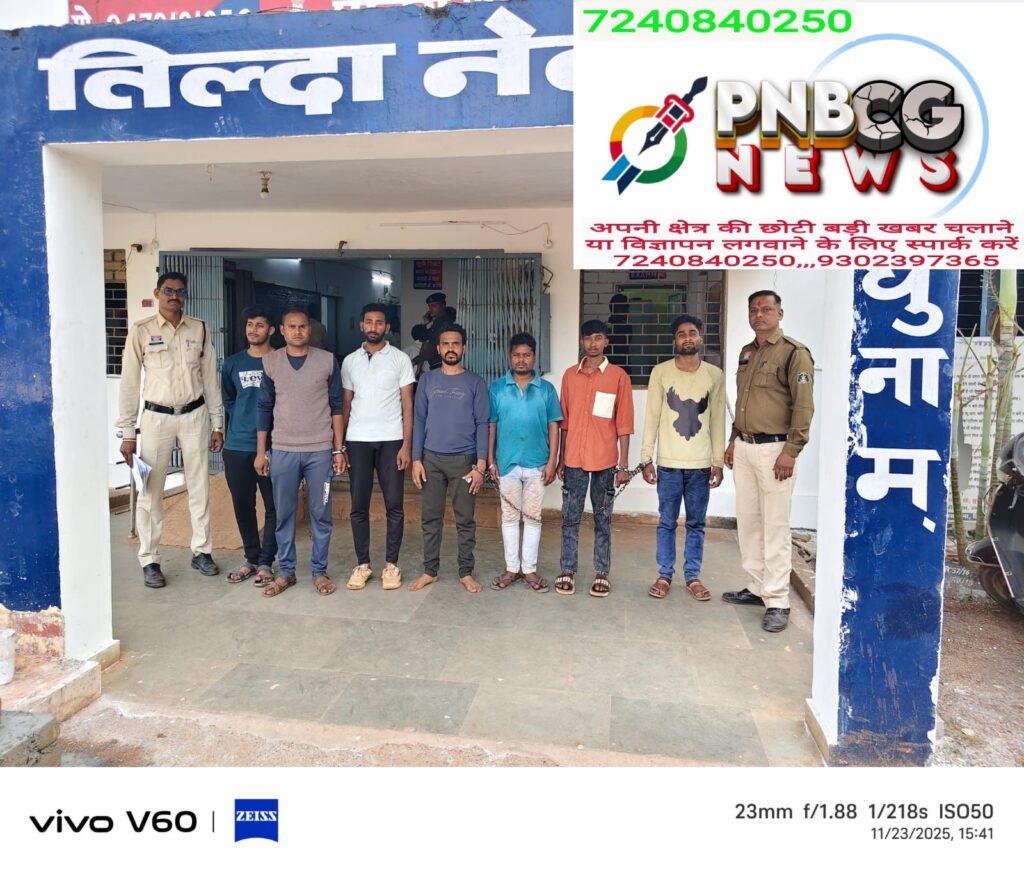 तिल्दा-नेवरा। रायपुर पुलिस द्वारा संचालित ऑपरेशन निश्चय के तहत थाना तिल्दा-नेवरा पुलिस ने नशा, अवैध शराब विक्रेताओं व असामाजिक तत्वों के खिलाफ लगातार कार्रवाई तेज कर दी है। 23 नवंबर 2025 को की गई विभिन्न कार्रवाइयों में आबकारी एक्ट के 02 आरोपी, आर्म्स एक्ट का 01 आरोपी, तथा 06 असामाजिक तत्वों को गिरफ्तार कर जेल भेजा गया।