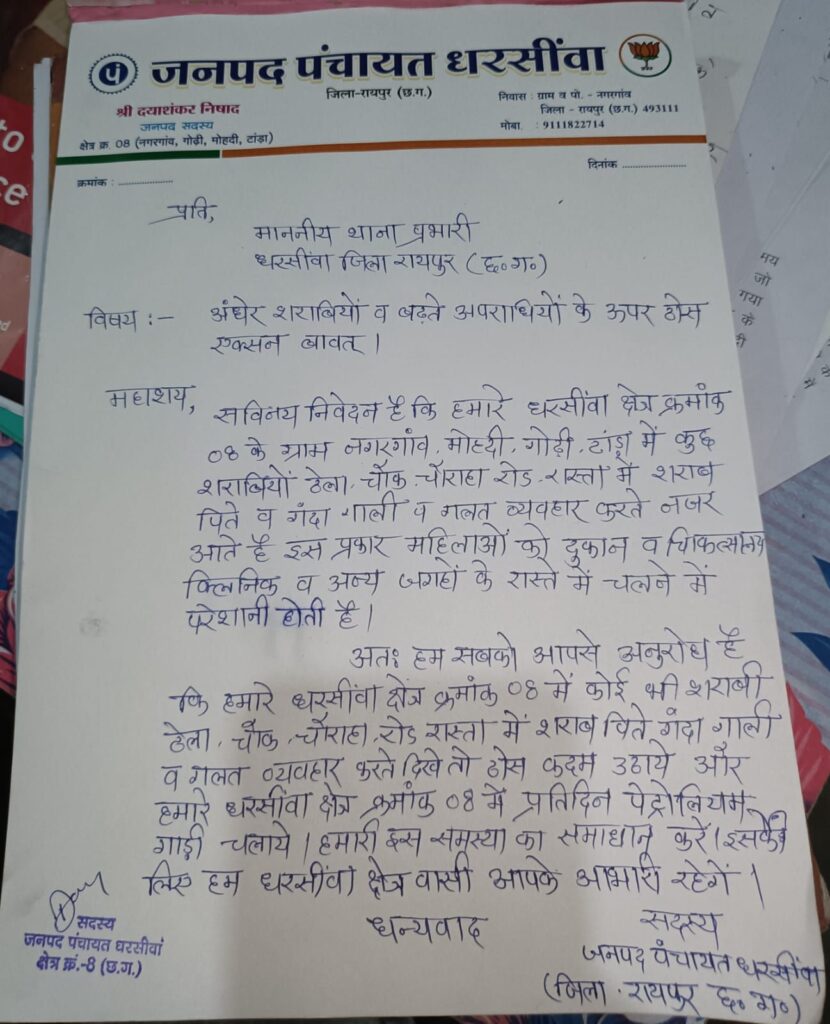 धरसींवा जनपद सदस्य दयाशंकर निषाद ने थाना प्रभारी को आवेदन देकर अपराधियों के ऊपर तुरंत एक्सन लेने को कहा।