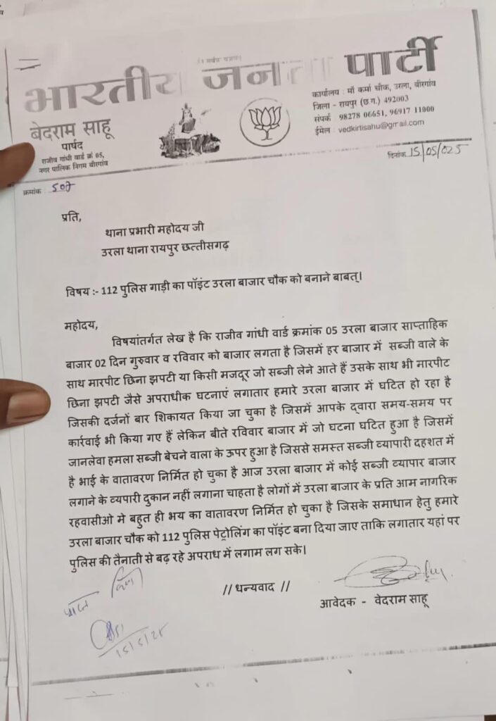 आज दिनांक 11/05/025 दिन रविवार को रात 11 बजे उरला बजार पर सब्जी व्यापारी से छिना झपटी कर मारपीट हुआ था जिसे बेहद गंभीर हालत मे हास्पिटल पर भर्ती कराया गया था अभी उसका ईलाज चल रहा है उस घटना के विरोध मे आज दिनांक 15/05/025 को सब्जी व्यापारी बजार बंद कर विरोध जताया और पुलिस प्रशासन से 112 पुलिस गाड़ी का पॉइंट उरला बाजार चौक को बनाने मांग किया गया है कि राजीव गांधी वार्ड क्रमांक 05 उरला बाजार साप्ताहिक बाजार 02 दिन गुरुवार व रविवार को बाजार लगता है जिसमें हर बाजार में सब्जी वाले के साथ मारपीट छिना झपटी या किसी मजदूर जो सब्जी लेने आते हैं उसके साथ भी मारपीट छिना झपटी जैसे अपराधीक घटनाएं लगातार हमारे उरला बाजार में घटित हो रहा है जिसकी दर्जनों बार शिकायत किया जा चुका है जिसमें आपके द्वारा समय-समय पर कार्रवाई भी किया गए हैं लेकिन बीते रविवार बाजार में जो घटना घटित हुआ है जिसमें जानलेवा हमला सब्जी बेचने वाला के ऊपर हुआ है जिससे समस्त सब्जी व्यापारी दहशत में है भय का वातावरण निर्मित हो चुका है आज उरला बाजार में कोई भी सब्जी व्यापारी उरला बाजार मे दुकान नहीं लगाना चाहता है धीरे-धीरे उरला बाजार अस्तित्व खतरे मे है उरला बजार के प्रति आम नागरिक रहवासीओ मे बहुत ही भय का वातावरण निर्मित हो चुका है जिसके समाधान हेतु पार्षद बेदराम साहू ने कहा बहुत लम्बे समय से उरला बजार को 112 पुलिस पेट्रोलिंग का पॉइंट बना दिया जाए ताकि लगातार यहां पर पुलिस की तैनाती रहेगी तब अपराध में लगाम लग सकता है, इस बात पर सभी व्यापारी आनी सहमती देते हुए अगले रविवार से पुनः सब्जी व्यापारीओ द्वारा बजार लगाये कीबातपर सहमति बन पाई इस मौके पर वार्ड पार्षद बेदराम साहू ,व वार्ड क्र. 01 पार्षद प्रतिनिधि पिकेश्वर बन्दे जी व सैकड़ो सब्जी व्यापारी उपस्थित हुए /धन्यवाद// आवेदक वेदराम साहू एवं समस्त उरला बाजार सब्जी व्यापारी संघ